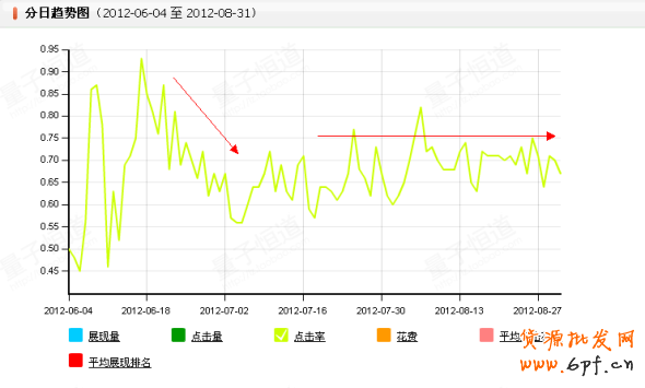 ②點(diǎn)擊率的提升。通過對紅標(biāo)的測試和更換點(diǎn)擊率低的關(guān)鍵詞匹配方式,刪除展現(xiàn)高沒有點(diǎn)擊的關(guān)鍵詞,進(jìn)一步提升CTR