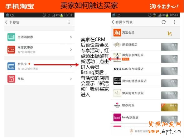 賣(mài)家在CRM后臺(tái)設(shè)置會(huì)員專(zhuān)享活動(dòng),無(wú)線(xiàn)端會(huì)在卡券包的listing頁(yè)紅點(diǎn)透出提醒有新活動(dòng),點(diǎn)擊進(jìn)入會(huì)員listing頁(yè)后,設(shè)置會(huì)員專(zhuān)享活動(dòng)的店鋪會(huì)顯示“新活動(dòng)”吸引買(mǎi)家入店選購(gòu):