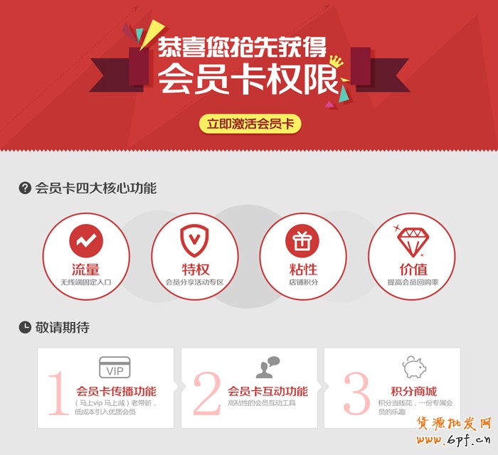 2、會(huì)員卡四大功能:無(wú)線(xiàn)端固定流量入口,會(huì)員專(zhuān)享活動(dòng)專(zhuān)區(qū),店鋪無(wú)線(xiàn)積分功能,提升會(huì)員二次回購(gòu)率