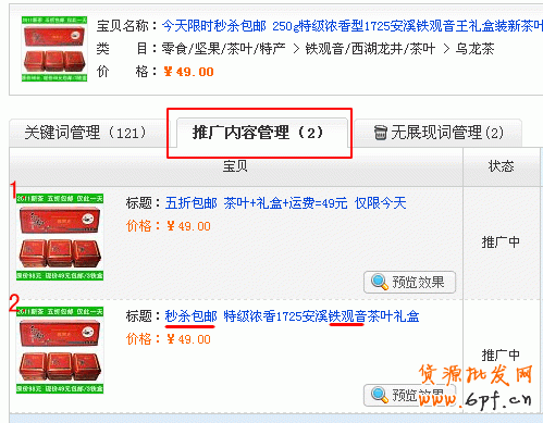 進(jìn)入推廣寶貝頁面,就可以看到推廣內(nèi)容管理,點擊進(jìn)去就可以編輯,一定要設(shè)置好兩個推廣標(biāo)題,標(biāo)題一定要簡潔明了,突出重點。舉例:圖2的關(guān)鍵詞:“鐵觀音 秒殺 包郵”,都在上圖標(biāo)題2(畫紅線處)出現(xiàn),所以它的關(guān)鍵詞相關(guān)性就是好。