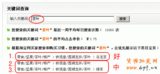 我們以“茶葉”為例總共出現(xiàn)3個類目,那么第一個類目才是好的類目,第2.3個類目相關(guān)性就是中,各位掌柜請按照個人的寶貝選擇合適類目放置,關(guān)鍵詞查詢頁面只是提供一個參考。