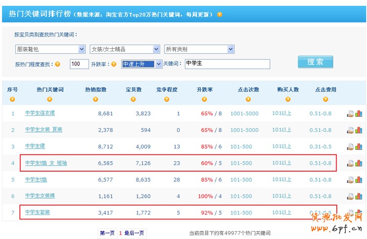 我 店里主營(yíng)的是休閑套裝,風(fēng)格是韓版的,比較適合16-25歲的女孩。掌柜得非常了解自己的產(chǎn)品,才能優(yōu)化出好標(biāo)題。大概10天前,我在熱門關(guān)鍵詞排行榜發(fā) 現(xiàn)了幾個(gè)好詞,下圖中紅色方框中就是好詞哦!搜索條件我選了高速上升,表示近期搜索量增大的。我們來(lái)看看“中學(xué)生女裝 夏裝”這個(gè)詞,寶貝數(shù)很少,點(diǎn)擊量卻很高,銷量也不錯(cuò),近期高速上升的,馬上收入囊中,同行可別發(fā)現(xiàn)呀,嘿嘿。。。