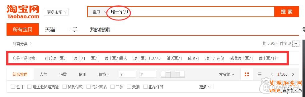 首先我們確定了,“瑞士軍刀”是自己店鋪寶貝的一個(gè)熱門關(guān)鍵詞,那么就在搜索框內(nèi)鍵入“瑞士軍刀”進(jìn)行搜索。大家會(huì)在搜索提示框旁邊看到這么一個(gè)信息:
