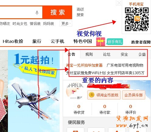 解釋:何為”視覺F原理“就是一個人視覺的一種趨勢習(xí)慣 就是我們?nèi)c開一個頁面的時候會首先第一視覺是右邊或者左邊平視的位置 然后才會選擇去俯視或者仰視 這個是指視覺上的 你們可以去測試一下 因為人的本能心里 所以很多地方用到了”視覺F原理“ 例如淘寶首頁也是一樣 所以淘寶規(guī)則 重要公告都會出現(xiàn)在F的那個點上 是因為大家進去以后會情不自禁的看過去,所以店鋪也需要 。