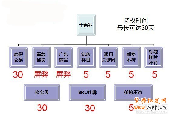 大家看到的紫色模塊里就是十項違規(guī)的名稱,下面的紅色的字體就是處罰情況(天數(shù)),那么,可以看到最嚴重的有兩項一項是重復鋪貨、一項是廣告商品