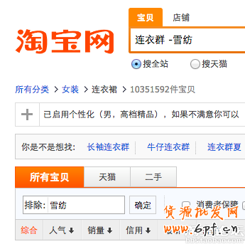 使用方法:輸入 關鍵詞 -tmall . 如:連衣裙 -tmall
