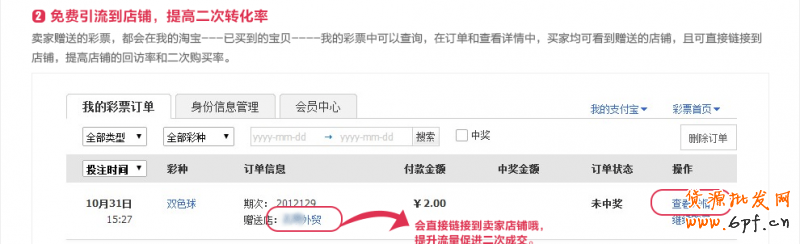 第六種,就是我們的彩票拉熟:彩票拉熟顧名思義就是給自己的朋友或者熟人送一注2元的彩票,吸引他們來到你剛剛開張的店鋪,為你的店鋪拉人氣,提升信譽(yù),促進(jìn)成交。這種彩票拉熟的方式是專門針對淘寶集市的中小賣家而設(shè)計(jì)。