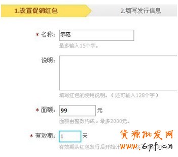 2、設(shè)置紅包:紅包名稱自己想,說明可填寫可不填寫,面額可自定,有效期,如果是刷件的話,一般都建議設(shè)置為一天,要是刷客有事沒用到紅包的話,那么紅包里的錢還是會自動返回到賣家的支付寶上的。