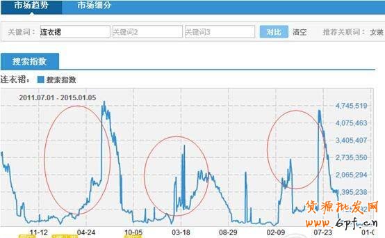 在上面的圖片我們可以看到連衣裙的市場(chǎng)容量占據(jù)了女裝的14%,是女裝的最大市場(chǎng)需求,再結(jié)合我們的需要,在2月份的時(shí)候?qū)⒆雎槊尴盗薪K端的連衣裙,接著就分析連衣裙,如何在正確的時(shí)間插入市場(chǎng)并且選到我們心中的爆款呢?
