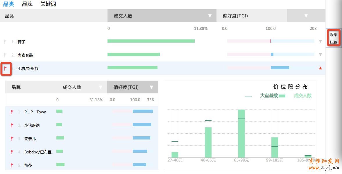 再看這些人群在全網(wǎng)細分類目下的偏好,包括偏好的品牌和價位段;從中我們可以看出,相關(guān)度高的葉子類目為童裝相關(guān)類目,喜歡購買童裝下 巴布豆等童裝品牌;