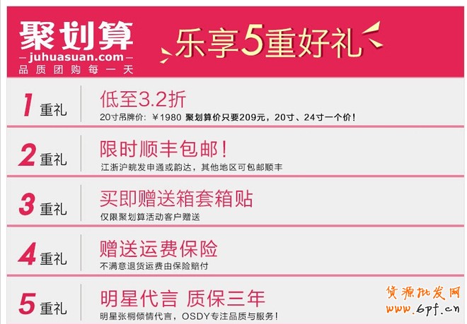 大大的聚劃算官方LOGO,醒目的12345邏輯利益點的排列,讓消費者一看就知道購買這款產(chǎn)品可以享受5大好禮。當然,若是在這個地方能夠圖文并茂的展現(xiàn)的話,可能效果會更好一些。