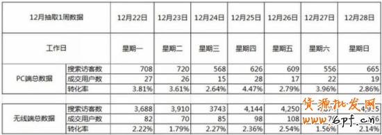 通過(guò)對(duì)11月的數(shù)據(jù)進(jìn)行對(duì)比,你發(fā)現(xiàn)了什么,不錯(cuò),PC端流量變化不大,但是無(wú)線端流量上升了2-2.5倍左右,但是轉(zhuǎn)化率缺下滑了,導(dǎo)致整體成交量還是差不多。到這里問(wèn)題還不嚴(yán)重,因?yàn)榭偝山徊畈欢?,表面看不出毛病,我們?cè)倏纯?月的數(shù)據(jù),問(wèn)題出現(xiàn)了。