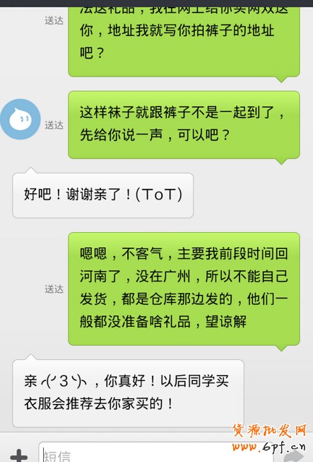 之前我就遇到過一個(gè)客戶,來到店里開始聊天,就說喜歡我的寶貝,問我可不可以送他一雙襪子,因?yàn)樗麤]襪子穿了,由于我也是做代理的,倉庫那邊是沒有小禮品這類的東西贈(zèng)送的,所以很無奈,但是卻又不想失去這來自不易的生意,于是我跟客戶說沒有禮品的,能不能少您幾塊錢,但是這個(gè)客戶就是不肯答應(yīng),非要一雙襪子,不用少錢,說完就下單了,沒辦法,我只有對(duì)客戶說好的,一定給您送,當(dāng)時(shí)我也很無奈,就去跟倉庫那邊說好話,讓他們幫忙買雙襪子,倉庫那邊說沒時(shí)間太忙,無奈之下,我就去淘寶買兩雙送給客戶,但是不知道該怎么跟客戶解釋,最終還是硬著頭皮給客戶發(fā)短信(因?yàn)榭蛻敉呀?jīng)下線了),大家可看下圖: