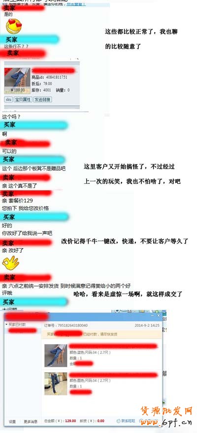 就比如說之前那些沒有聊天就直接下單的客戶,我一般等到訂單確定之后,我看旺旺如果在線的話,我就會(huì)主動(dòng)去給他們說一些話,比如 說“親,您的訂單已經(jīng)收到了,下午五點(diǎn)之前我們統(tǒng)一安排發(fā)貨”,或者下午五點(diǎn)之后直接下單的客戶我都會(huì)留言給他們“親,您的訂單收到了,由于時(shí)間玩了,明 天給您發(fā)貨,謝謝您的支持”等等這之類的話語,如果客戶比較和藹的話,一般都會(huì)回復(fù)我們,這樣子我們與客戶之間的感情就更進(jìn)一步了。這樣子得到的結(jié)果就是,客戶對(duì)我們的寶貝非常滿意,會(huì)及時(shí)來給我們好評(píng),而且會(huì)耐心的寫評(píng)語,其實(shí)這就是我們想要的,得到客戶的認(rèn)可,并非是一個(gè)個(gè)訂單,客戶收到之后就等待默認(rèn)好評(píng)了,如果前期工作做好了,那么,如果出現(xiàn)任何的售后問題,我們的客戶對(duì)我們就不會(huì)惡言相對(duì),處理起來比較方便了。其實(shí)這點(diǎn)主動(dòng)營銷也是我們與客戶溝通的最大好好處,很有可能讓一個(gè)一次性的客戶,成為我們的老客戶。