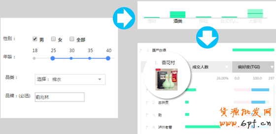 (2)購買黃金酒的人群跨類目購買偏好;他們除了購買黃金酒,還喜歡買中老年的服裝,兒童的棉衣,特別喜愛俞兆林的服飾,巴拉巴拉、優(yōu)貝宜的童裝,喜歡購買鈣片、魚油保健品等滋補(bǔ)營(yíng)養(yǎng)品保健品,他們是孝敬父母養(yǎng)育兒女上有老下有小的男人;