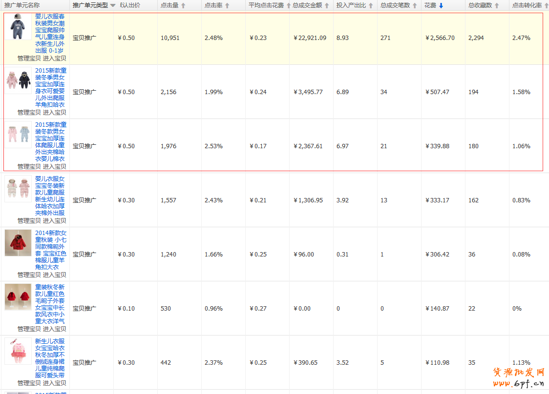 從上面的圖中的產(chǎn)品中,我們可以看到紅框里面的三款寶貝,流量是比較大的額,且點擊率也是比較高,并且ppc方面也是響度一比較低,而轉(zhuǎn)化率也是遠(yuǎn)遠(yuǎn)高于其他產(chǎn)品。而從成交筆數(shù)上看,也是比較高的,并且ROI也是在眾多寶貝中脫穎而出,所以根據(jù)上述的3個維度分析,這三款寶貝經(jīng)過測試分析后,可以成為賬戶里面的主推寶貝。
