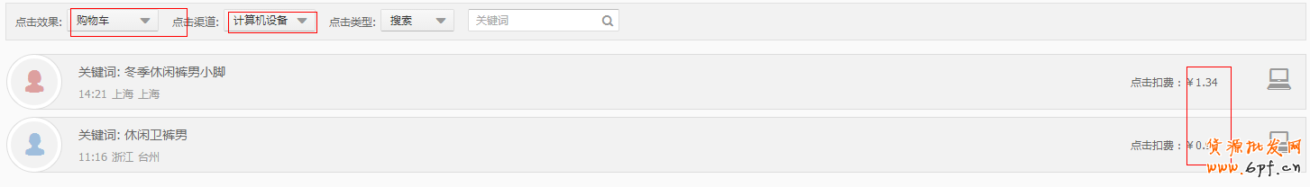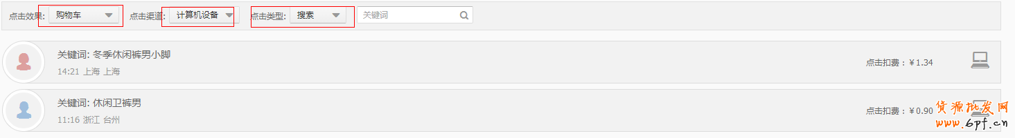 2、接著根據(jù)點(diǎn)擊效果、點(diǎn)擊渠道和點(diǎn)擊類型來篩選關(guān)鍵詞,或者搜索某個(gè)關(guān)鍵詞來看數(shù)據(jù)。