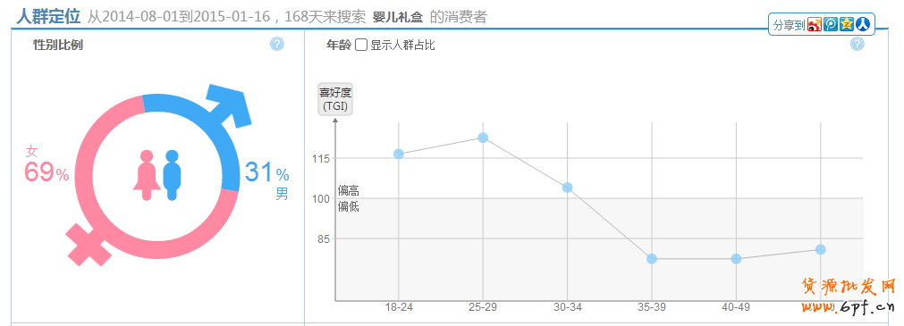 自定義搜索人群主要由三個(gè)維度組成,分別是性別、年齡和月均消費(fèi)幅度,對于如何勾選這些選項(xiàng)進(jìn)行投放,小編主要是從行業(yè)找大方向,再根據(jù)寶貝自身的特點(diǎn)進(jìn)行投放測試。開始時(shí)可以先在淘寶指數(shù)上搜索類目大詞,例如:嬰兒禮盒,根據(jù)其顯示的結(jié)果可以看出,這個(gè)類目女性占比較大,男性較少但也占到了31%,還是具有一定市場,年齡段主要集中在18-24,25-29和30-34歲,35歲到50歲以上占比較少,消費(fèi)能力主要集中在中高層;接下來從自身寶貝的情況分析,在生意參謀中-經(jīng)營分析-商品分析-寶貝效果-選擇對應(yīng)寶貝查看其訪客特征,成交客戶主要是女性居多,那么接下來在投放時(shí)可以綜合以上的這些特征,對女性,年齡在18到34歲的重點(diǎn)投放,其次是男性18-34歲,溢價(jià)低于女性。