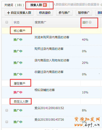 【搜索人群】針對了三大人群進(jìn)行溢價(jià)投放,分別是:核心客戶、潛在客戶、自定義人群