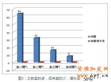 完全不懂電商的人,根據(jù)常識都會發(fā)現(xiàn)圖1更符合心理需求。發(fā)展的勢頭越來越好,誰看著都高興,搜索引擎也是一樣。對于排序算法來講,它也希望看到一個寶貝的銷量呈現(xiàn)爆發(fā)增長的勢頭。雖然它看不懂這寶貝是什么,為什么賣這么好,但它據(jù)此相信這個寶貝就是受買家歡迎的寶貝,應(yīng)該給買家更多的展示,也就是說排序的時(shí)候更為靠前。而如果寶貝的銷量一周不如一周,圖3所示,搜索引擎就會懷疑,寶貝是否不受人喜歡,是否存在轉(zhuǎn)化問題,開始懷疑的結(jié)果就是在排序的時(shí)候相應(yīng)往后調(diào)整。