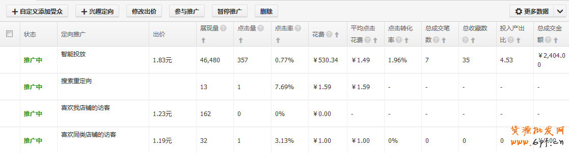 中低預(yù)算的推廣方面的推廣設(shè)置則與以上的相反,側(cè)重加大重定向和喜歡我店鋪的訪客、喜歡同類店鋪的訪客通投底下這三個(gè)做精準(zhǔn)定位,但是見效方面較之只能投放差很多,主要是春節(jié)前后的流量低迷所致。