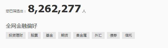 2)使用“投資理財(cái),股票,基金,期貨,貴金屬,外匯,債券,信托”的全集或子集【如果自家有理財(cái)類產(chǎn)品;也可配套使用其他標(biāo)簽】圈定人群進(jìn)行廣告投放;如果自家沒有理財(cái)類產(chǎn)品,也同樣可以使用這些標(biāo)簽圈定潛在人群