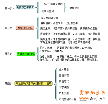 做好了引流,就需要談論點擊率,點擊率公式為:點擊率=點擊量/展現量。怎樣優(yōu)化點擊率,從公式可以看出,一是增加點擊量,二是減少不必要的展現,下面一張圖簡單的概括了點擊率優(yōu)化的流程: