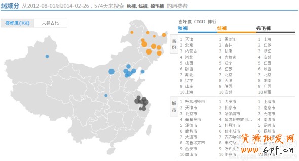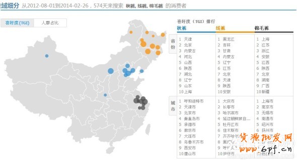 做服裝類的人可能很清楚,秋褲,線褲,棉毛褲這三個(gè)稱呼其實(shí)就是同一樣產(chǎn)品。從圖我們可以看出,在東北黑龍江這幾個(gè)地方的人他們的習(xí)慣搜索線褲,而在北京這個(gè)地區(qū)的人習(xí)慣搜索的是秋褲 ,在長(zhǎng)江中下游地區(qū)這幾個(gè)地方的人又更喜歡搜索棉毛褲。
