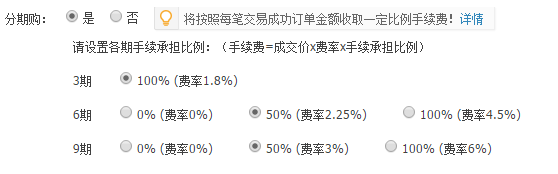建議店鋪70%的商品設(shè)置上天貓分期,一方面是為了增加權(quán)重,另一方面是為了讓顧客得到更好的購(gòu)物體驗(yàn).最后小yao在這里告訴大家一個(gè)小竅門(mén),如果同行產(chǎn)品設(shè)置了100%買(mǎi)家承擔(dān)手續(xù)費(fèi),那么您就可以設(shè)定50%這樣替買(mǎi)家承擔(dān)一半,也是好的賣(mài)點(diǎn).