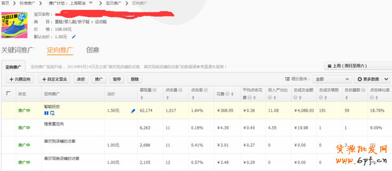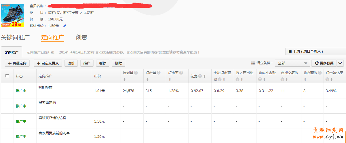 如圖所示,最后一款寶貝,只能投放默認出價1.5,一周后咱們可以從數(shù)據(jù)反饋中得出,明顯的這款寶貝是以上三款中最不適合推廣定向這塊的,展現(xiàn)以及點擊量這塊等等各個方面都是要比前兩個低一些,因此最適合做定向這塊的是第一款寶貝。