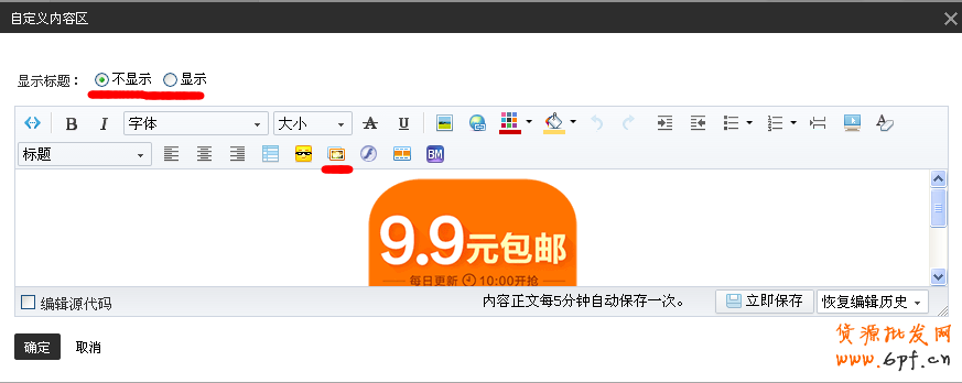 添加成功后對添加的自定義區(qū)進行編輯,如下圖操作,首先在顯示標(biāo)題欄:不顯示(選擇這個是為了美觀),點擊下方紅線標(biāo)記的圖片按鈕,添加我們剛才下載的圖片,添加完畢后跟下圖一致,并且我們讓它居中對齊