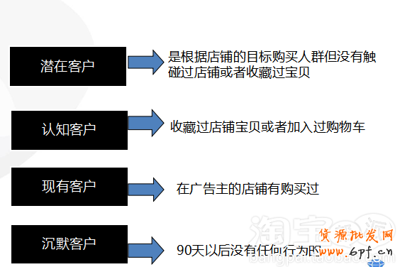首先我們看一下場景定向:它根據(jù)客戶對咱店鋪的行為來進(jìn)行細(xì)分為:潛在客戶、認(rèn)知客戶、現(xiàn)有客戶、沉默客戶四種。我給大家列了個表格形式給大家講解,來區(qū)分他們的行為。