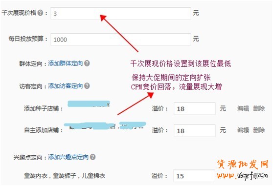 1、 定向,可以訪客定向和興趣點(diǎn)定向?yàn)橹?,建議現(xiàn)階段CPM價(jià)格低的時(shí)候,用更少的錢買到更多的流量,可保持大促期間擴(kuò)大定向的范圍,請注意點(diǎn)擊率反饋,持續(xù)保持去差留優(yōu)~