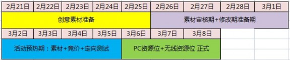 i:小二給大家做一個時間軸的安排大家可以參考參考一般活動提前2周做好規(guī)劃,素材 審核 競價 定向 正式投放