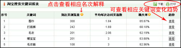 另外,可以用“趨勢(shì)查看”功能查看隨著時(shí)間的變化,每個(gè)關(guān)鍵詞的到達(dá)頁(yè)瀏覽量、搜索次數(shù)及跳失率的變化趨勢(shì),為您及時(shí)優(yōu)化寶貝的名稱以便能夠被高效地搜索到提供參考。
