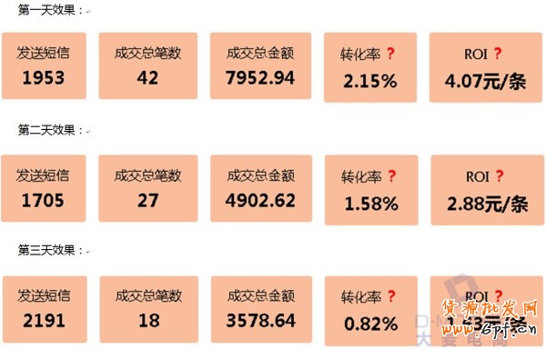 這種方式平均每天消耗4000條短信,當(dāng)然主要還是看店鋪的老客戶數(shù)量有多少。每天早上7點(diǎn)準(zhǔn)時(shí)發(fā)送短信,報(bào)時(shí)今天天氣狀況,氣溫,是否會(huì)下雨,是否轉(zhuǎn)天氣,然后后續(xù)加一句問(wèn)候的說(shuō)話,如:XXX提醒親^-^ 今天氣溫27度,紫外線指數(shù)強(qiáng),建議親帶太陽(yáng)傘哦,保護(hù)好皮膚,給自己過(guò)舒適的一天,就像xxx為您的小腳丫提供的舒適一樣。