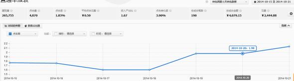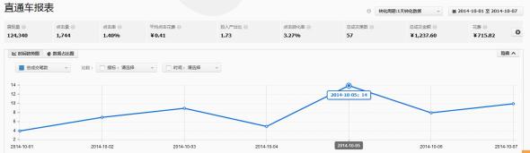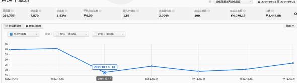 合作之初,掌柜對(duì)于雙十一并沒(méi)有想法,只是單純的想通過(guò)直通車(chē)帶動(dòng)全店的銷(xiāo)量,我們一直也是在努力的配合掌柜,10月份第一周,也是十一黃金周,這個(gè)周人群的購(gòu)買(mǎi)欲望不大,基本都在出游或者已經(jīng)購(gòu)物完成的階段,買(mǎi)家的購(gòu)買(mǎi)力不強(qiáng),我們的建議做法是保守做法,穩(wěn)扎穩(wěn)打,同時(shí)也是做好店鋪的基礎(chǔ)功。此時(shí)直通車(chē)每天的花費(fèi)在100元以?xún)?nèi),從未超過(guò)100元,流量也維持在200-240個(gè)之間,ppc在0.4元;這期間直通車(chē)的日成交量約為8-15筆之間。