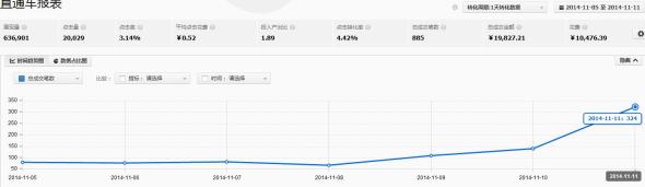 從這個(gè)表上可以清晰的看到,10號(hào)我們預(yù)熱的有點(diǎn)過(guò)頭,已經(jīng)超了11號(hào)的流量和花費(fèi),這個(gè)是我們值得反思的地方。雙十一當(dāng)天,我們獲得了比較大的成功,詳情見(jiàn)下表: