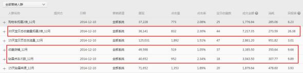 DMP后臺(tái)的報(bào)表統(tǒng)計(jì)到的是3天之內(nèi)的回報(bào)率,我們可以觀察幾個(gè)表現(xiàn)特別突出的人群。