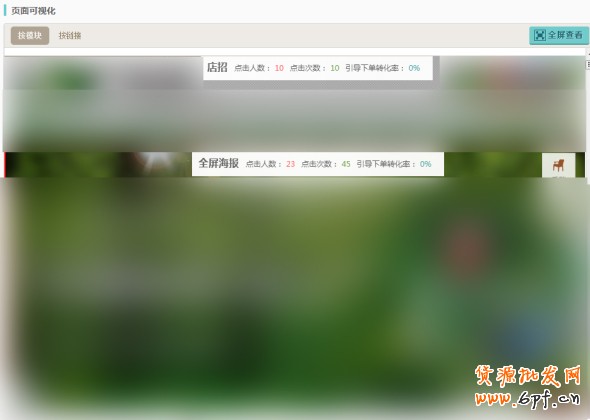 “頁面可視化”則直觀地用圖片展示的方式來說明店鋪的點擊人數(shù)、次數(shù)及轉(zhuǎn)化率的情況。更能直接反應(yīng)店鋪出現(xiàn)問題的原因。如某一模塊,擺放位置很好,而點擊人數(shù)卻很少,則說明可能圖片質(zhì)量不好;如某些重要圖片而質(zhì)量也很好,但點擊人數(shù)不多,則說明可能位置擺放不正確;若某個模塊點擊率很高,而引導(dǎo)下單轉(zhuǎn)化率很低,則說明可能擺放的寶貝不太受歡迎。當(dāng)然,除了按模塊分析,也可以按鏈接分析。圖片左上方就可以直接點擊“按鏈接”即可顯示頁面內(nèi)每個鏈接的“點擊數(shù)次數(shù)”或“點擊人數(shù)”,從而能更好完善頁面,。