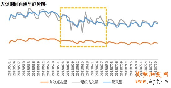 從直通車趨勢圖上可以看出,展現(xiàn)量、點擊量受大促影響不大,但是成交額增量明顯,是投放性價比較高的時間。