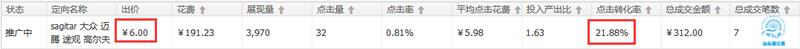 如上圖,原先出價為9塊(賬戶反饋較差,價格需要拉高)現(xiàn)在降至6元,價格雖然較高流量也較少,但點擊轉化率高達21.88%,比行業(yè)高很多。掌柜可以根據(jù)自己的預算來控制ppc。