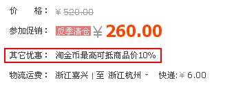 買(mǎi)家在寶貝詳情頁(yè)面可以看到淘金幣抵扣的優(yōu)惠提示