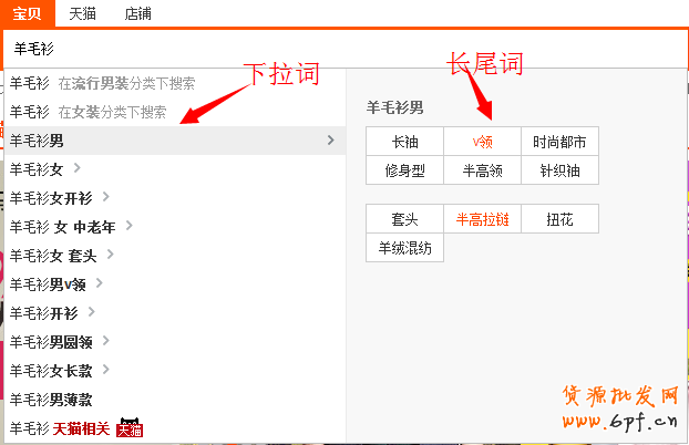 1、通過淘寶的下拉詞、長尾詞和相關(guān)詞。