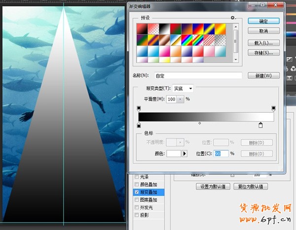 3、對三角形的圖層進行漸變疊加,拉黑白漸變,白色滑塊角度設置為百分之百,位置設置為百分之九十。