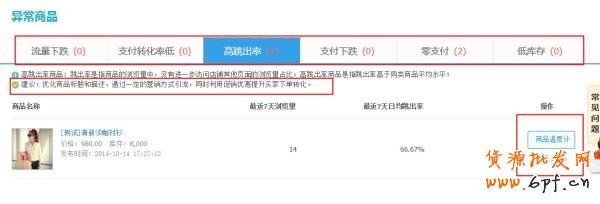 想知道每天店鋪哪些寶貝流量下跌很嚴(yán)重,哪些寶貝支付轉(zhuǎn)化率過(guò)低,哪些寶貝成交突然下跌了,哪寶貝沒(méi)有成交量,哪些寶貝要補(bǔ)庫(kù)存啦。店鋪商品量太大,分析太難了???NONONO,只要使用”異常商品“,系統(tǒng)自動(dòng)幫你找出每日問(wèn)題寶貝,好的建議一定要看要及時(shí)改進(jìn)哦!