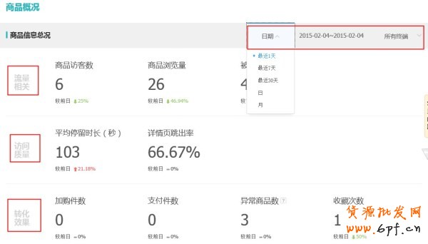 1、商品信息總況,從流量相關(guān)、訪問(wèn)質(zhì)量、轉(zhuǎn)化效果三個(gè)維度來(lái)看店鋪商品數(shù)據(jù),在時(shí)間周期上提供了最近1天、最近7天、最近30天以及自然日、自然月的時(shí)間選項(xiàng),并且可以按所有終端、PC端、無(wú)線端,不同終端來(lái)詳細(xì)分析!