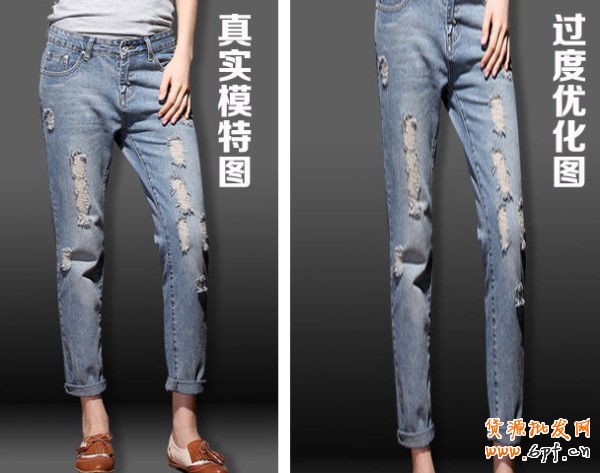 案例:比如為了顯瘦,牛仔褲的模特圖經(jīng)常被P的過度導致失真。