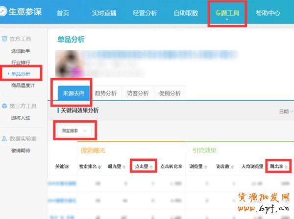 在專題工具-單品分析的來源去向里,可以清楚的看到你每個關(guān)鍵詞的點擊率和跳出率,你就可以驗證你的關(guān)鍵詞是不是精準匹配,點擊量小的,跳出率也就高。