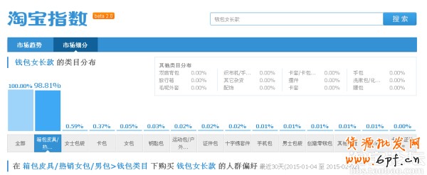 錢包類目占比達到98%,其他只有2%,因此我們可以理解為這個關(guān)鍵詞對應(yīng)的權(quán)重最高的類目是: 箱包皮具/熱銷女包/男包>錢包(這個例子沒有什么代表性,只是分享一下判斷方法)